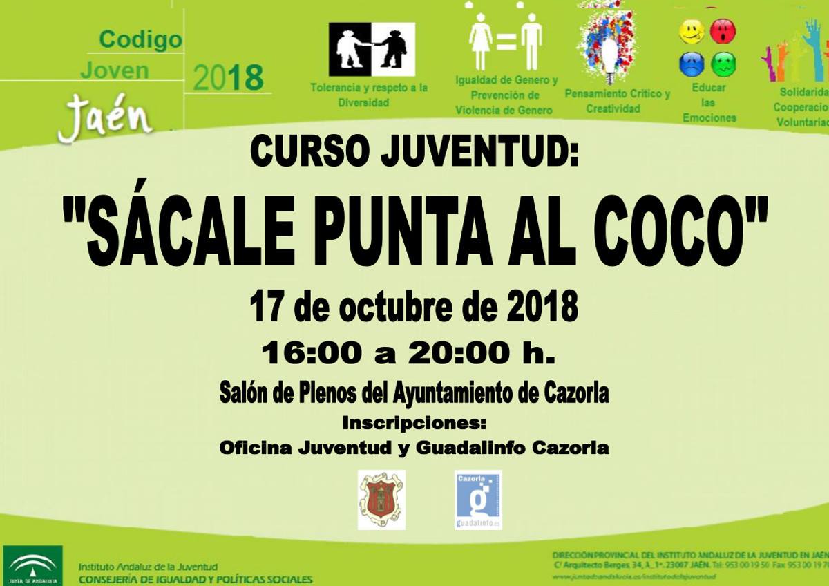 Desde la Oficina de la Juventud de Cazorla proponemos a tod@ aquel que esté interesad@ el Curso de Juventud: «Sácale Punta al Coco» un taller que pretende trabajar y desarrollar la tolerancia y respeto a la diversidad, igualdad de género y prevención de la violencia de género, pensamiento crítico, creatividad, educar las emociones y la […]