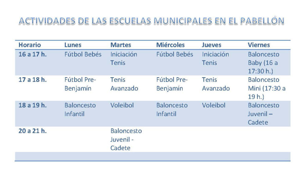 Presentamos los horarios de las Escuelas Municipales Deportivas para el curso 2018 – 2019 que se realizarán en Pabellón Municipal y Campo de Fútbol Los Halcones – Carlos Romero, además, escuela de pádel martes y jueves de 19 a 21 horas en las instalaciones propias.